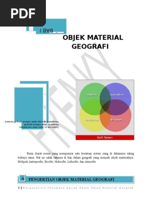 Objek material geografi ada lima, yaitu: Objek kajian (objek material) geografi adalah fenomena geosfer meliputi atmosfer, lithosfer, biosfer, hydrosfer, dan anthroposfer. Hidrosfer (lapisan air) berupa lautan. Objek formal objek formal geografi adalah cara pandang dan berpikir terhadap gejala yang ada di permukaan bumi. Salah satu bagian yang harus dipahami siswa adalah objek formal dan objek material. Kajian kedua aspek tersebut dasarnya adalah lapisan geosfer. Objek material geografi merupakan bahan kajian dalam mempelajari geografi. Objek material geografi adalah fenomena geosfer (permukaan bumi) yang meliputi atmosfer (lapisan udara), litosfer dan pedosfer (lapisan batuan dan tanah), hidrosfer (bentang perairan), biosfer (dunia tumbuhan dan hewan), dan antroposfer (manusia). Pola sebaran gejala tertentu dipermukaan bumi (spacial patern). Objek material geografi adalah sasaran atau isi kajian geografi. Adapun yang termasuk objek kajian geografi adalah fenomena geosfer terdiri dari: Objek studi formal adalah sudut pandang atau cara berfikir terhadap gejala geosfer sebagai objek material geografi, baik fisik ataupun sosial. Namun kita tidak memahami betapa.